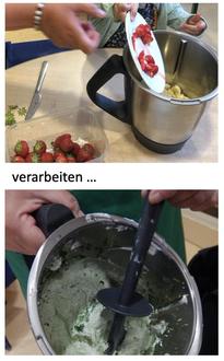 Die dritte Gruppe der Größeren und Großen hatte viel zu tun. Einige Kinder stellten einen Fruchtquark aus Heidelbeeren, Erdbeeren und Bananen mit etwas Zitronenmelisse, wenig Zucker und Quark her.