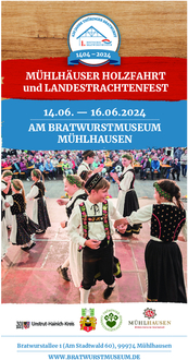Vom 14. bis 16. Juni 2024 findet das 15. Landestrachtenfest in Mühlhausen statt. In diesem Jahr wird das Fest auf dem Gelände des 1. Deutschen Bratwurstmuseums gefeiert und bietet ein buntes Programm für die ganze Familie.
