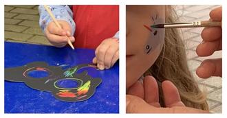 Schwarze Tiermasken können ausgekratzt werden, dabei kommen Regenbogenfarben zum Vorschein. Bunte Elefanten, Schmetterlinge und Löwen Masken tragen die Kinder mit Stolz auf ihren Köpfen. Am Stand der Kinderschminke bildet sich immer wieder eine große Traube, die verschiedenen Farben und Motive machen alle Kinder neugierig. Auch die Haare der Kinder können mit Haarkreide eingefärbt werden und durch selbstgeflochtene Haarbänder geschmückt werden. Verschiedene Glitzer Tattoos funkeln auf den Armen und werden bestaunt.