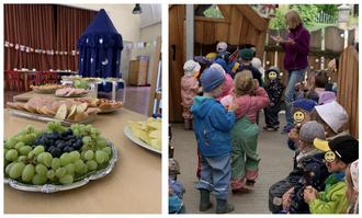 Aber zurück zum Anfang: wir stehen vor den Türen zum Saal, singen und schauen in gespannte Kinderaugen. An einem großen Buffet warten herzhafte und süße geschmierte Brote, Obst und Gemüse und leckere Getränke auf die Kinder. Bei fröhlicher Musik lassen wir es uns, in unserer großen Runde, im bunt geschmückten Saal schmecken und stärken uns für den Tag.