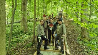 Jens Wittrich (v.r.), Regionalleiter Mitte der NaturStromProjekte GmbH, und sein Team engagierten sich bereits zum dritten Mal im Rahmen des Corporate Volunteering-Programmes des Nationale Naturlandschaften (NNL) e.V. im Nationalpark Hainich. Diesmal hieß das Projekt: Instandsetzung der Himmelsleiter.