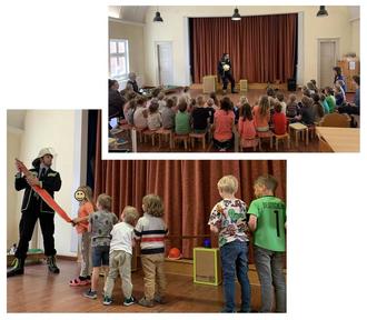 Mitten im Großen Spiel- und Spaßgewirr ertönte unser Gong. Im Saal wartete eine Überraschung auf alle Regenbogenkinder. Ein Feuerwehrmann stand mitten in unserem Saal, neben ihm eine Pappkiste auf Rollen und er lud alle Kinder ein, auf einem der Hocker Platz zu nehmen. Der Mann war aber kein echter Feuerwehrmann, er war ein Schauspieler und begeisterte alle in den folgenden 45 Minuten mit der Geschichte: „Bei der Feuerwehr wird der Kaffee kalt!“. Aus der großen Pappkiste holte er immer wieder neue, aus Pappe gebastelte Gegenstände, die sein Schauspiel unterstützten. Es kamen Sitzkissen, Brote und Tassen zum Vorschein und wurden an die Kinder verteilt. So konnten alle aktiv am Schauspiel teilnehmen. Außerdem brauchte der Feuerwehrmann viel Hilfe beim Schlauchausrollen, um das Haus von Frau Eierschecke zu löschen. Emil Zahnlücke ist in den gefrorenen See eingebrochen und musste mit einer langen Leiter gerettet werden. Auch dabei halfen einige mutige Feuerwehrleute aus dem aufgeregten Publikum. Das Theaterstück war eine gelungene Überraschung zum Kindertag und wir danken herzlich dem Landestheater Eisenach für dieses großartige Theater-Ein-Mann-Stück. Es ist unbedingt weiterzuempfehlen!