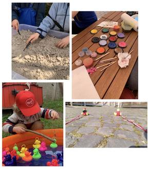 Gleich nach dem Frühstück wurden auf dem Hof und im Garten einzelne Stationen aufgebaut. Unter unserem großen Zelt wurden viele Gesichter der Kinder bunt geschminkt und verschiedene Tattoos schmückten die Arme der Kinder. In einem kleinen Schwimmbecken schwammen bunte Enten und konnten mit kleinen Angeln geangelt werden. Gar nicht so einfach im bewegten Wasser etwas an den Haken zu bekommen. Kleine rote Autos wurden um die Wette an einem Strick über den Hof gerollert. Die Aufgabe bestand darin den Strick mit dem Auto schnellstmöglich auf einen Stock aufzurollen.