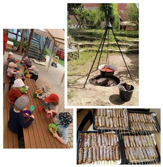 Schon während des gesamten Vormittages bereiteten unsere Hausmeister die Feuerstelle vor und entzündeten das Lagerfeuer. Darüber wurde später in einem großen Topf leckere, rote Feuerwehrsoße erhitzt. Pünktlich zu unserer Mittagessenszeit kamen frisch gekochte Nudeln dazu und beides zusammen ergab ein leckeres Mittagessen für uns alle. Alle Kinder und Pädagogen saßen draußen auf Bänken und an Tischen und konnten gemeinsam zu Mittagessen.