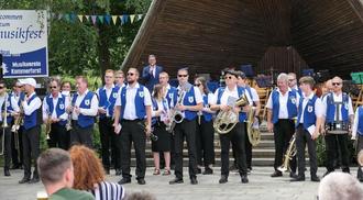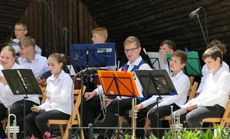 Natürlich hatten auch der Gastgeber unter der Leitung von Dr. Tristan Koppe und das dazugehörige Schülerorchester des Musikvereins Kammerforst, dirigiert von Dietmar Fischer, ihren Auftritt. Der Programmzettel beinhaltete traditionelle Blasmusik wie “Hinter der Garage” und “Böhmischer Wind”, gesungen von Simon Gössel und Max Ludwig. Stimmung kam auf bei Stücken von James Last. Den “Happy Sound” des großen Entertainers haben die Kammerforster immer wieder drauf. Erinnerungen wurden wach bei einem Medley aus Songs von Simon and Garfunkel. Zum Klassiker „Hoch Heidecksburg“ bebte der Festplatz beim Obergut.