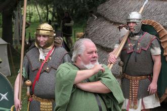 Das Römische Reich wurde immer größer. Um Grenzen zu verteidigen und um eroberte Gebiete dauerhaft zu sichern, wurden dort immer mehrere Legionen stationiert. Das Militär etablierte sich am Ort in stark befestigten Kastellen. Legionen waren militärische Einheiten mit mehreren tausend Legionären, Hilfstruppen und Tross. Im Tross zogen Händler, Dienstleister und die Familien der Legionäre. Zum Römermarkt 2023 dabei war auch wieder ein Krieger der Hilfstruppen.