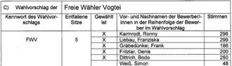 Auf den Wahlvorschlag entfallen die in der nachfolgenden Aufstellung aufgeführten gültigen Stimmen.