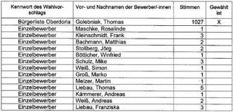 In der Gemeinde Vogtei OT Oberdorla wurde am 26.05.2024 folgendes Wahlergebnis festgestellt: