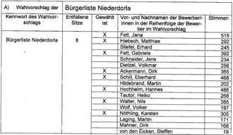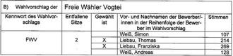 Ferner bitte ich, die Angaben der Reihenfolge der Bewerber im Wahlvorschlag und die Zahl der auf den Wahlvorschlag entfallenden Sitze sowie die Namen der Gewählten unter Angabe des Kennwortes des Trägers des jeweiligen Wahlvorschlags zu entnehmen.