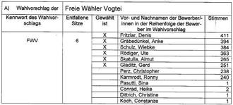 Auf den Wahlvorschlag entfallen die in der nachfolgenden Aufstellung aufgeführten gültigen Stimmen.