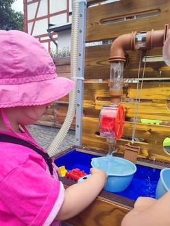 An unserer Wasserbahn sind wir gemeinsam im Dialog mit der Natur. Wir können viel experimentieren, Naturgesetze erforschen und müssen miteinander absprechen, wie das Wasser laufen soll. Wir treten in Dialog mit dem Material, um herauszufinden, was die verschiedenen Röhrensysteme, Schieber, Mühlräder und die große Pumpe bewirken. Im Dialog unter den Kindern wurde festgestellt, dass es mehrere Kinder braucht, um den kompletten Wasserkreislauf in Schwung zu bringen. Manch einer hat im Dialog mit sich selbst erkannt: Einer allein schafft es nicht. Auch unsere Eltern sind ganz begeistert vom neuen Spielgerät. Im Dialog mit der Familie haben unsere Kinder die ersten Tage gemeinsam mit ihren Eltern am Nachmittag gespielt und gestaunt.