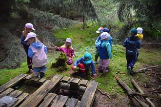 So eine Wanderung macht ganz schön viel Hunger. Zum Glück brachten uns Manfred und Elke mit dem Quad unser Lieblingsmittagessen (Nudeln mit Tomatensoße) zu unserem Rastplatz. So viele spannende Entdeckungen machten unsere Minis und die Mittleren dann doch ganz schön müde. So zogen sich die Jüngsten zum Schlummern in den Bauwagen zurück. Die Mittleren machten es sich auf einem Decken- und Matratzenlager auf der kleinen Waldbühne gemütlich. Die Großen und Größeren aber gingen nach dem Mittagessen auf Entdeckertour in den Wald. Sie fanden Zapfen, Stöcke und kleines Getier und bauten eine Bude. Unser Tag in der Natur verging wie im Fluge. Nach einem kleinen Nachmittagssnack machte sich alle wieder auf den Heimweg. Viele Eltern warteten im Kindergarten schon auf uns. Sie konnten von ihren Kindern zu Hause sicher viele spannende Geschichten über unsere Wanderung erfahren.