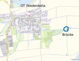 Es ist die Brücke im Koppelweg, östlich von Niederdorla, über den Seebach, genannt Wilder Graben, bekannt als Siebenmühlenbach, in Oberdorla die Schille.