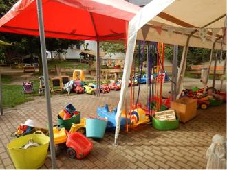 Im Garten des Kindergartens wurden unter anderem die kleineren Zelte und die meisten Sonnenschirme gut verpackt und eingelagert, Pflaster und Eingangsbereich mit Hochdruck gesäubert, eine Holzbank abgeschliffen und neu gestrichen sowie der Spielzeugschuppen ausgeräumt, grundlegend gereinigt und neu sortiert.
