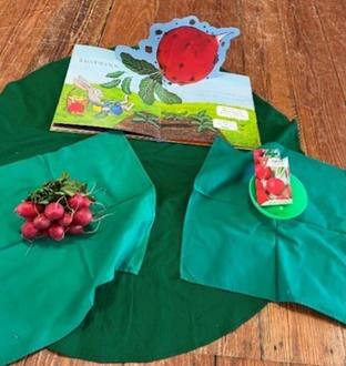 Immer wieder beobachteten wir die Veränderungen an unserem Apfelbaum im fortschreitenden Frühling bis in den Sommer hinein. Dabei stellte sich den Kindern schnell die Frage wie Pflanzen eigentlich wachsen. Und so fanden wir das Buch: „Rosi pflanzt Radieschen“ von Axel Scheffler und Cate Petty. Der Hase Rosi liebt Radieschen. Mit Hilfe des Regenwurms und des Marienkäfers säht er auf einem kleinen Beet Radieschen aus. Er pflegte und hegte sie unter Anleitung seiner beiden Freunde, bis er wirklich tolle Radieschen ernten konnte.