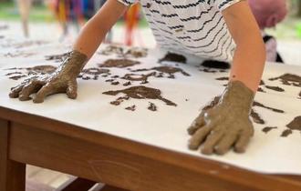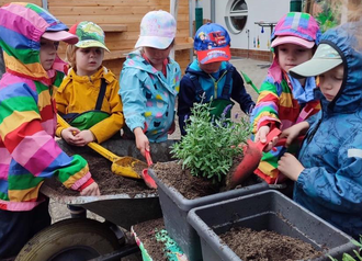 Gemeinsam mit ihnen stießen wir auf einen Affen, der am Baum kletterte und uns die Schöpfungsgeschichte näherbrachte. Ein großer Dinosaurier versetzte uns auf eine Zeitreise, bei der wir verschiedenste Dinos - Langhälse und Fleischfresser - kennenlernten, geheimnisvolle Dinosauriereier ausgraben konnten, leckeren Urzeitkuchen naschten und sogar einen echten Vulkanausbruch miterlebten. Auf der Suche nach weiteren fossilen Funden in der Erde trafen wir auf eine kleine sprunghafte Maus. Sie zeigte uns das Leben unter der Erde. So konnten wir viele kleine Insekten und andere Lebewesen beobachten, kennenlernen und mit ihnen bei einer Insektendisco durch den Matsch tanzen. Aber nicht nur wundervolle Lebewesen entdeckten wir in unserem verwunschenen Wald. Auch verschiedenste Pflanzen wachsen im Wunderwald nebeneinander. Eine kleine Pilzgruppe entführte uns in den Hainich, denn „im Wald ist eigentlich immer irgendwas los“. Wir fühlten Baumrinden, bestaunten die Umgebung durch wundersame Himmelsgucker und entdeckten verschiedene Spuren von Waldtieren wie zum Beispiel einen Hasen hinter einem Busch. Auch ein Kaktus wuchs mitten im Wunderwald - ein echter Überlebenskünstler. Wir schauten in Büchern, welche Wüstenpflanzen es noch alles gibt und bepflanzten unseren neuen Zaun mit duftendem Lavendel. Wir lernten, dass auch der Lavendel ein Überlebenskünstler ist. Er wächst am liebsten bei einfachsten Bedingungen im Sand-Erde-Gemisch, weil sich dort das Wasser nicht staut. Bei einem kleinen Experiment konnten wir mit eigenen Augen sehen, dass Wasser schneller durch Sand fließt als durch Erde. Sehr exotisch kam uns auch die Bananenstaude am Laubbaum vor. Da wollten wir gleich alle einmal naschen! In unseren heimischen Gärten fanden wir erstaunliches zum Riechen und Verkosten. Verschiedene Gartenkräuter wie Minze, Melisse, Colakraut, Basilikum und Schnittlauch wurden erklärt und probiert. Auch viele spannende Früchte wurden ertastet, gerochen und verkostet: Papaya, Physalis, Ananas, Honigmelone, Nashibirne, Mango, Maracuja und Kokosnuss. Sie alle wachsen in entfernten Ländern.