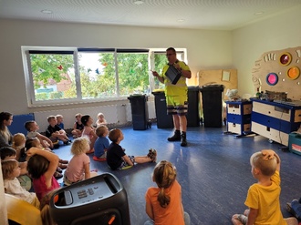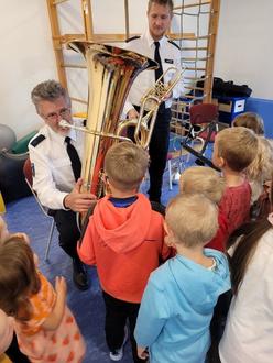 Am 21.09.23 war das Thüringer Musikkorps bei uns zum dritten Mal zu Besuch. Sie hatten ein musikalisches Märchen mit dabei, dieses hieß "Das Waldhaus". Es spielte die Tuba die bunte Kuh, die Posaune das Hühnchen, die Trompete das Hähnchen und die Klarinette den Erzähler. Dabei haben die Kinder viel gelacht und konnten das Märchen mitgestalten. Nach dem Märchen durften die Kinder noch die Instrumente anschauen und festhalten. Es war eine richtig schöne musikalische Unterhaltung für all unsere Kinder.