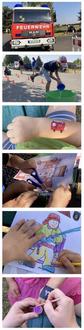 Und so traf an diesem Samstagnachmittag um 14.00 Uhr eine Abordnung des Regenbogenteams am Feuerwehrhaus ein. Wir hatten so einiges vorbereitet: z.B. Kinderschminken und Glitzertatoos. Auf so manchem Handrücken, aber auch auf den Wangen konnte man an diesem Tag kleine Feuerwehren oder glitzernde Schmetterlinge, aber auch die glitzernden Zeichen von Superhelden entdecken. Die Kinder konnten 2 verschiedene Modelle von Feuerwehrautos basteln und Bilder von Feuerwehren ausmalen. In einem Suchbild musste die wichtige Notrufnummer 112 gefunden werden. Auf Grund der großen Hitze hatten wir noch einen Parcours aufgebaut. Hier musste Wasser von einer großen Wanne zur nächsten transportiert werden. Vorher musste man das Wasser mit Schaufeln in einen Eimer schaufeln und dann so schnell wie möglich durch die Hindernisse flitzen. Das war gar nicht so leicht!
