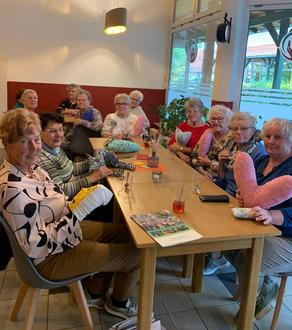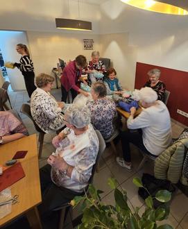 Bei Kaffee und Kuchen haben wir für Patienten, die an Brustkrebs erkrankt sind, Herzkissen gefüllt.