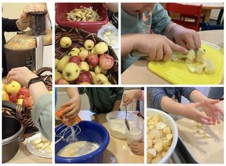So wie wir mit der Gemeinde teilen, teilen auch viele Familien mit uns im Kindergarten ihr Obst und Gemüse aus den Gärten. In diesem Jahr bekamen wir besonders viele Äpfel und Birnen in großen Kisten aus den heimischen Gärten. Es waren so viele, dass sie trotz unserer täglichen Obst & Gemüse-Naschrunden, nicht weniger wurden. Also haben wir gemeinsam beschlossen aus unseren Vorräten noch etwas anderes zu machen als sie einfach zu essen. Gemeinsam haben wir das Obst gewaschen, geschält und in eine große Küchenmaschine gesteckt. Heraus kam lecker Apfel-Birnensaft in wunderbar herbstlichen Farben. Dieser hat besonders frisch und lecker geschmeckt - wie meistens, wenn man etwas selber macht. Nach prüfenden Blicken in die großen Apfelkisten in unserem Keller haben wir festgestellt, dass immer noch ausreichend Äpfel da sind. Also haben wir beschlossen daraus Apfelkuchen zu backen. Gesagt getan, in unserem Kindertreff war reges Treiben, Mehl und Zucker wurden vermischt, Eier aufgeschlagen und Äpfel in kleines Stücken geschnitten. Gemixt, gerührt und natürlich probiert. Aus unserem Ofen zog ein leckerer Kuchengeruch durchs ganze Haus und beim Kaffeetrinken konnten endlich alle großen und kleinen Menschen im Kindergarten Langula probieren. Mhmm… wie lecker!