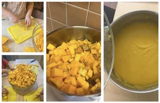 Gemeinsam mit den Kindern wurde zuerst der Kürbis klein geschnitten und anschließend mit Möhren, Kartoffeln, Zwiebeln und Gewürzen in den Topf gegeben und zu unserer leckeren Suppe verkocht. Alle haben mit geholfen und das war auch gut so, dieser Kürbis war nämlich wirklich groß und es gab daher einiges zum Kleinschneiden. Nach dem Probieren, ob sie gut gelungen war, musste sie Erkalten, denn die Suppe wurde erst einmal eingefroren, um dann pünktlich zur Wichtelstube über dem Feuer erwärmt zu werden.