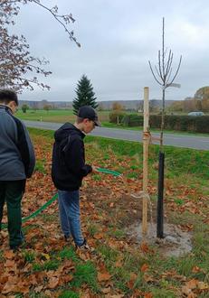 Als erstes mussten die Löcher wieder mit Erde befüllt werden, damit die jungen Bäume möglichst gerade stehen. Damit der Wind die Bäume nicht einfach wieder umwirft, wurde jeweils ein Pfosten eingeschlagen und der Jungbaum daran angebunden. Anschließend kam noch ein Verbissschutz an den Stamm. Zu guter Letzt wurde ordentlich gewässert.