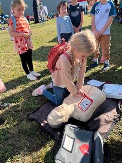 Weiter ging es zu einem Defibrillator, hier haben wir erfahren, was das eigentlich für ein Ding ist und was man damit anfangen kann. An einer Übungspuppe wurde gezeigt, wie es funktioniert und wer wollte durfte sich auch mal in der Herzdruck-Massage probieren.