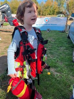 Weiterhin haben wir uns noch das Fahrzeug vom THW anschauen dürfen. Einmal ins Auto setzen und die ganzen Geräte anschauen hat natürlich auch dazu gehört. Bei der Wasserwacht waren die Kinder ganz mutig: alle sind ins Boot eingestiegen. Die schwere Rettungsweste durfte auch mal anprobiert werden.