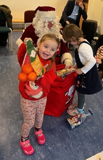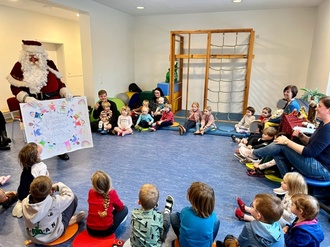 Am 6. Dezember hatten wir hohen Besuch. Wer kann es sein? Es war natürlich der heilige St. Nikolaus. Im tiefen Schnee kam er angestapft und hatte auch einen vollgepackten Sack dabei. Alle Kinder waren freudig aufgeregt, was er uns wohl tolles mitgebracht hat! Doch zuerst durfte sich der Nikolaus über ein kleines Programm aus Liedern und Gedichten der Kinder freuen. Aber dann war die Spannung der Kinder kaum noch auszuhalten und alle wollten wissen, was im großen schweren Sack ist. Die Kinder durften sich über verschiedene Spiele, Bücher, weihnachtliche Naschereien und Obst freuen und auch einen Scheck über 200€, welcher unserem Förderverein zugute kommt. Im Gespräch mit dem Nikolaus konnten alle Kinder von ihren Überraschungen am Morgen in ihren Stiefeln berichten. Zum Abschied sangen alle gemeinsam das Lied „Lasst uns froh und munter sein“.
