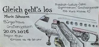 Der Darstellen-Gestalten-Kurs der 10. Klassen des Friedrich-Ludwig-Jahn Gymnasiums Großengottern lädt herzlich zum neuen Theaterstück ein! In diesem Jahr verwandelt sich die Bühne in einen Flughafen, an dem unterschiedlichste Menschen, Geschichten und Überraschungen aufeinandertreffen. Zwischen Ankunft und Abflug entstehen humorvolle, spannende und nachdenkliche Szenen, die den Alltag am Flughafen lebendig werden lassen.
