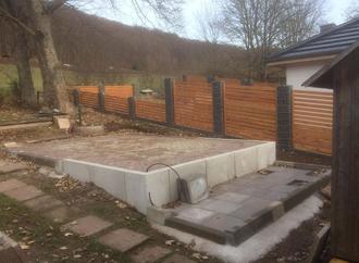 Die neuen Fundamente sind gesetzt, die Fläche für den Gemeinschaftsraum ist gepflastert und die Fläche für den Waschbereich ist mit Platten belegt.