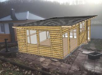 Bild von dem geplanten Neubau. Zugang von vorn mit einem Tor und daneben mit einer Tür. Zwei Fenster auf den Nordseite und ein Fenster auf der Westseite.
