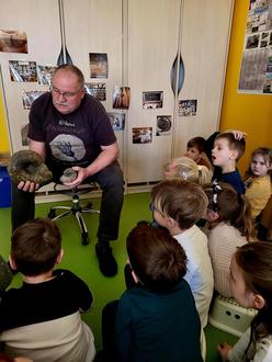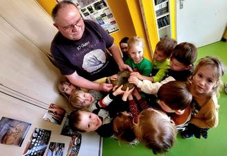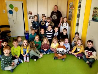 Hobby- Paläontologe Michael Hunstock aus Frankenroda reiste mit reichlich schwerem und spannendem Gepäck an. Neben Fotos seiner umfangreichen Sammlung von Fossilen, die er gemeinsam mit seinem Sohn Robert zusammengetragen hat, brachte er auch für jedes Kind ein echtes Fossil aus der Urzeit mit. Über eine Stunde lauschten 23 Kinder wie gebannt dem kindgerechten Vortrag des Dinoforschers. Sie stellten Fragen und staunten über die Informationen. Wusstet ihr, dass Oberdorla mal ein Meer war? Deshalb findet man heute auf den Feldern Versteinerungen von Muscheln, Amoniten und Nautiliten.