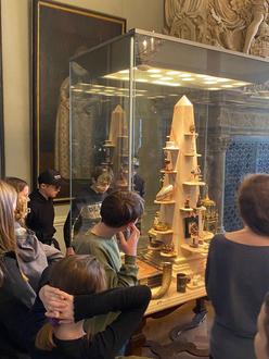 Das nächste Reiseziel war eine Führung durch das Schloss Friedenstein. Die Kinder waren beeindruckt von der Größe des Schlosses. Während der Führung durch das Schloss kamen sie auch am Schlafzimmer sowie am Gesprächszimmer und am Esszimmer der herzoglichen Familie vorbei. Schließlich konnten sie auch den Thronsaal bewundern. In der Kunstkammer waren Schätze aus aller Welt ausgestellt. Hier sind Kunstwerke aus Elfenbein, Bernstein und Silber zu sehen. Beeindruckend war zum Beispiel ein Schachbrett aus Bernstein oder ein Elefant aus vergoldetem Silber, sogar vergoldete Trinkgefäße. Die Geschichte des Schlosses geht bis zu 400 Jahre zurück.