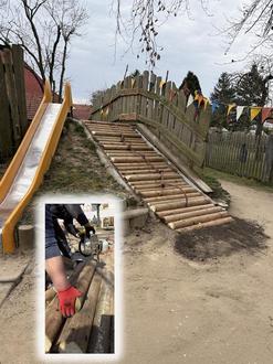 Die Papas hatten große Geräte dabei, wie Schubkarre, Schaufeln, Hacke, Kettensäge und Akkuschrauber. Ein paar Papas kümmerten sich um den Aufgang an unserer Rutsche, dort waren die Balken morsch geworden und mussten erneuert werden.