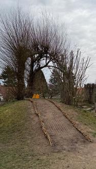 Auf unserem Berg kümmerten sich ein paar Papas darum, dass er einen schöneren Aufgang bekommt und befestigten die Antifallschutzmatten neu. Sie wurden unterstützt von weiteren Papas, welche aus Weide ganz lange Bündel machten für die Wegbegrenzung. Unsere Sandkiste wurde wieder einmal komplett umgegraben und gesiebt und das Fußballtor hat auch eine neue bessere Standfläche für den Torwart erhalten.