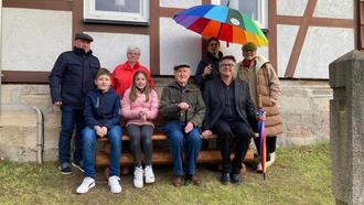 vl. 2. Reihe: Ortsteilbürgermeister Bodo Dittrich, Sigrid Rollberg, Pfarrerin Apitzsch-Pokoj und Jaqueline Paul vorne sitzend von links: Lukas Arnold, Martha Volk, Ortschronist Armin Walther, Regionalbischof Tobias Schüfer