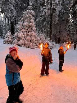 Anschließend machten sich bei schönstem Winterwetter die Grundschüler/innen, Lehrer sowie Eltern zu einer Fackelwanderung zur Thüringer Hütte auf den Weg. Unterwegs wurde bei Glühwein und Punsch gerodelt. Auch flog so mancher Schneeball durch die Luft. An der Thüringer Hütte angekommen wurden Bratwürste und warme Getränke gereicht.