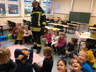 Im Rahmen des Projektes „Brandschutz“ besuchte uns Lars Opatz von der Feuerwehr Oberhof. Er erklärte uns sehr viel über die Aufgaben der Feuerwehr und zeigte uns seine Kleidung. Die Handschuhe und den Helm durften einige Kinder aufsetzen. Die waren ganz schön schwer!