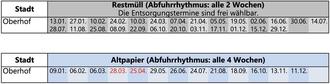 | Restmüll: | Für Grundstücke, die nicht mit den Regelfahrzeugen anfahrbar sind, gelten gesonderte Entsorgungstermine. Bitte wenden Sie sich hierzu direkt an den Entsorger. |