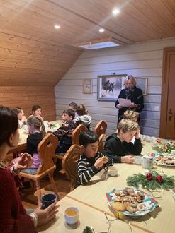 Die Kinder erfuhren dann, was auf dem Wappen von Lillehammer zu sehen ist und welche Geschichte hinter den „Birkebeineren“ steckt. Nun wurde - auch nach norwegischer Tradition - Reisbrei in kleinen Schälchen serviert. In einem davon war eine Mandel versteckt, und wer diese fand, durfte das nicht verraten! Erst, wenn alle aufgegessen hatten, durfte er sich melden und wurde dann für diesen Nachmittag als „Mandelkönig“ mit einer Krone geehrt. Diesmal war es wieder eine Mandelkönigin …