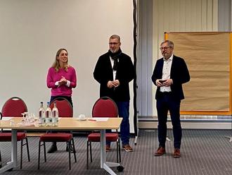 Tina Gellert von der gemeinsamen Wirtschaftsförderung der KAG und André Knapp (Oberbürgermeister Suhl) sowie Alexander Brodführer (Bürgermeister Schleusingen) begrüßen die Teilnehmer. Der Friedberg liegt auf der Gemarkung beider Städte.