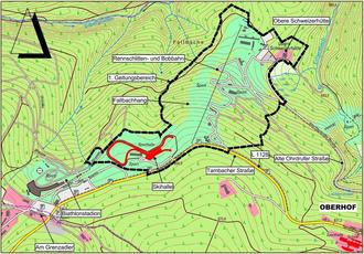 Das Plangebiet (1. Geltungsbereich) liegt etwa 1 km westlich der Ortslage von Oberhof, an der Landesstraße 1128 (Tambacher Straße), welche von Oberhof Richtung Steinbach-Hallenberg führt. Der 1. Geltungsbereich wird im Wesentlichen im Norden von Wald, im Osten von der „Alten Ohrdrufer Straße“ sowie von Wald, im Süden von der „Tambacher Straße“ (L 1128) sowie von Wald und im Westen überwiegend von Wald sowie untergeordnet von der Lotto Thüringen Arena am Rennsteig (Biathlonstadion) begrenzt. Im 1. Geltungsbereich befinden sich die Lotto Thüringen Eisarena Oberhof (Rennschlitten- und Bobbahn), der Lotto Thüringen Bikepark Oberhof bzw. der Lotto Thüringen Snowpark Oberhof (Fallbachhang), die Lotto Thüringen Skisport-Halle Oberhof (Skihalle) und die Obere Schweizerhütte (Pension & Restaurant).