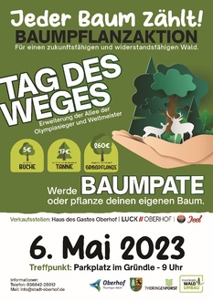 Auch in diesem Jahr wird anlässlich des „Tag des Weges“ wieder eine Baumpflanzaktion durchgeführt. Unter dem Motto „Jeder Baum zählt“ können Interessierte einen Beitrag zur nachhaltigen Gestaltung unseres Waldes leisten und Baumpate werden. Als Baumpatenschaften stehen folgende Möglichkeiten zur Verfügung: