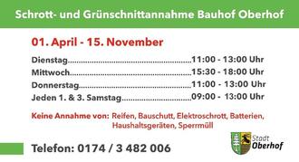 Ab dem 1. April 2026 ist die Grünschnittannahme am Bauhof Oberhof wieder eröffnet. Bürgerinnen und Bürger können ihre Grünschnittabfälle direkt in die bereitgestellten Container entsorgen. Angenommen werden ausschließlich Pflanzenabfälle, die an die öffentliche Abfallentsorgung angeschlossenen Grundstücken stammen (entsprechend der Regelungen der aktuellen Abfall- und Abfallgebührensatzung des Landkreises).