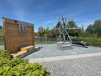 Was früher eine unansehnliche Fläche mit abgetretenem Gras und Unkraut war, ist dank des engagierten Einsatzes unseres Bauhofes nun ein gepflegter und einladender Platz geworden. Die Schneeflocken-Skulptur, das Podest mit Stadtwappen und der Rodelbob symbolisieren eindrucksvoll den Wintersportstandort Oberhof.