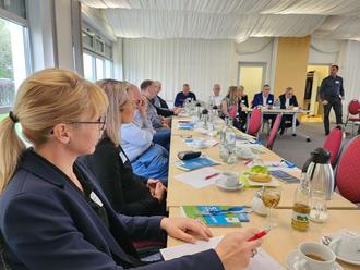 Beim jüngsten Unternehmerfrühstück des Friedberg Management Stammtisches zeigten 35 Vertreter aus 15 Branchen, wie wichtig Vernetzung, Austausch und gemeinsames Engagement für die Zukunftsfähigkeit der Region sind (im Bild vorne links: Katharina Vetter, von Zwerrenz GmbH Suhl und Silvia Färber-Pfannschmidt von Schaeffler Industrial Drives Suhl)