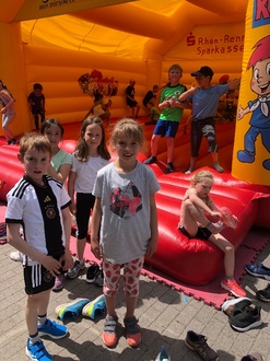Auf dem Schulhof und in der Turnhalle stellten sich die Sportvereine der Stadt vor. Die Klassen konnten gemeinsam die Sportarten Fußball, Ringen, Leichtathletik, Tanzen, Tischtennis, Tennis, Motorsport, Karate und eine Hüpfburg ausprobieren.