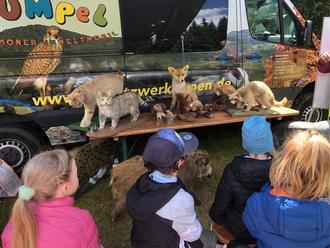 Michael Kirse besuchte uns mit seinem „Rumpelmobil“ am 13.06.2024 und erzählte uns sehr viel über das Leben im Totholz. Sehr interessant wurde es, als wir mit Lupe und Experimentierwerkzeug eigenständig Kleintiere auf dem Waldboden suchen durften. Im Anschluss bestaunten wir die Tiere über ein Lupenmikroskop an einem Bildschirm. Ganz schön überrascht waren wir über die sehr vielen Füßchen der Tausendfüßler.