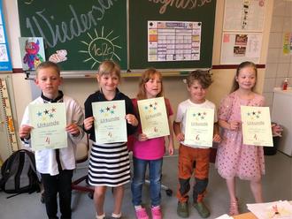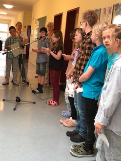 Verabschiedet wurde die Klasse 4 mit einem Programm der 1.-3. Klasse. Gedichte und Lieder erfreuten nicht nur die Kinder, sondern auch die zuschauenden Eltern. Wir wünschen den Viertklässlern viel Erfolg an der neuen Schule.